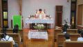 マリア様へのご挨拶とくつトントンまでは楽勝でも、その後の入室までの手続きがタイヘン。まず、制服をスモック(作業着)に着替えないといけない。そうです、おシゴトが始まるからです。右手を右の袖に通すのはわかるが、逆さに持ったものだからコンガラガッテしまった。何とか修正したもののボタンかけがタイヘン。そうそう右手で押して左手でひっぱる。分ってるんだけど、このボタン何とかならないの?それでも、助けを求めるでもなく、またイライラすることもなくマイペースで死苦八苦の約5分。何とか三つめに挑戦。さすがに最終戦は、少し手こずったもののかなりスムーズにできたものだから自分をほめたくなったらしい。「かんたんだった!」こうして自立心が一気にアップ。