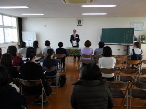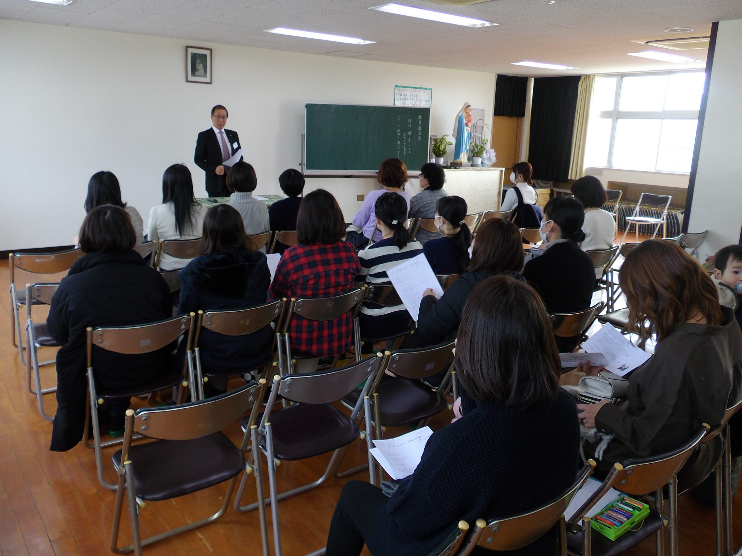 本園では、子育て支援の一環として、教育講演会を開催いたしました。今回は、幼稚園と小学校の連携の意味合いも含めて、大明丘小学校の榊眞一校長先生を講師にお招きして、「学校と一緒に子供を育てる ~幼児期からの家庭教育~」というテーマの下、約一時間お話をしていただきました。まずはじめに、園長から講師の紹介をして、さっそく講演をしていただきました。「学校ってどんなところ?」「練習が必要なものって?」「皆さんが子育てをしている時代とは」など、基本的なところからわかりやすく説明していただき、ご自分の貴重な体験等を通したユーモアあふれるお話でした。特に、「大切なものは目に見えない」「見ようとする努力が必要」ということばが強く印象に残りました。ご来園いただいた保護者の方々も、うなづいたり、メモを取ったりして大変熱心に聞き入っている様子でした。今回のお話を参考にして、今一度家庭教育について考えて、実践していただきますようお願いいたします。