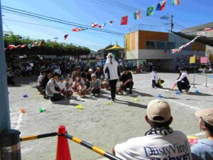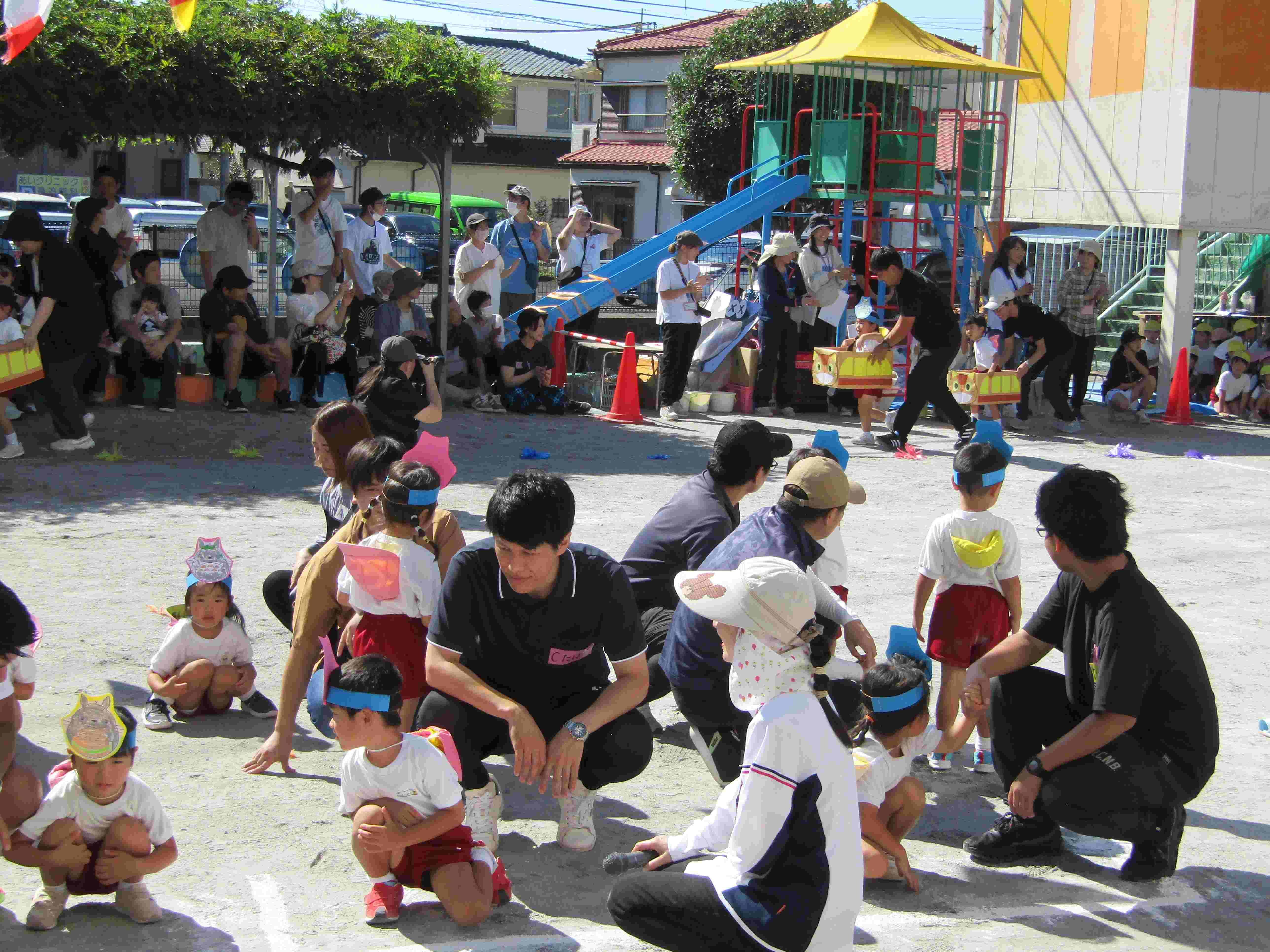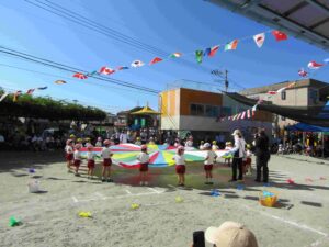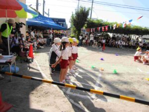 10月12日(日)に、運動会を開催いたしました。当日は、心配された台風の影響もほとんどなく、絶好の秋晴れとなり、多くの保護者の方々のご参観もいただき、運動会を無事、開催することが出来ました。園児たちはこれまでの練習の成果を生かして、一生懸命走ったり演技したりすることができました。当日は、開会式に先立ち、Aグループによるオープニング「パラウエーブ」から、始まりました。その後、開会式をしました。「園児はじめの言葉」や「クラスのお約束」など、元気いっぱい発表することができました。次に、体操をして、学年別の「かけっこ」をしました。どの子も一生懸命走ることができました。その次は学年別の「おゆうぎ」や「器械運動(跳び箱、鉄棒)・組体操」を披露しました。その後、親子競技をして、最後にリレーをしました。途中で、ころんだりする子もいましたが、その後すぐに立ち上がって走りぬきました。最後に閉会式をして、無事に終了することができました。どの子も一生懸命取り組んで、すばらしい運動会になりました。保護者の皆様も多数ご来園いただいて、応援や運営に取り組んでいただきました。誠にありがとうございました。