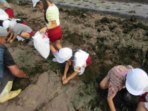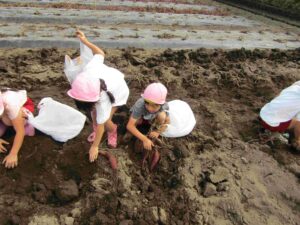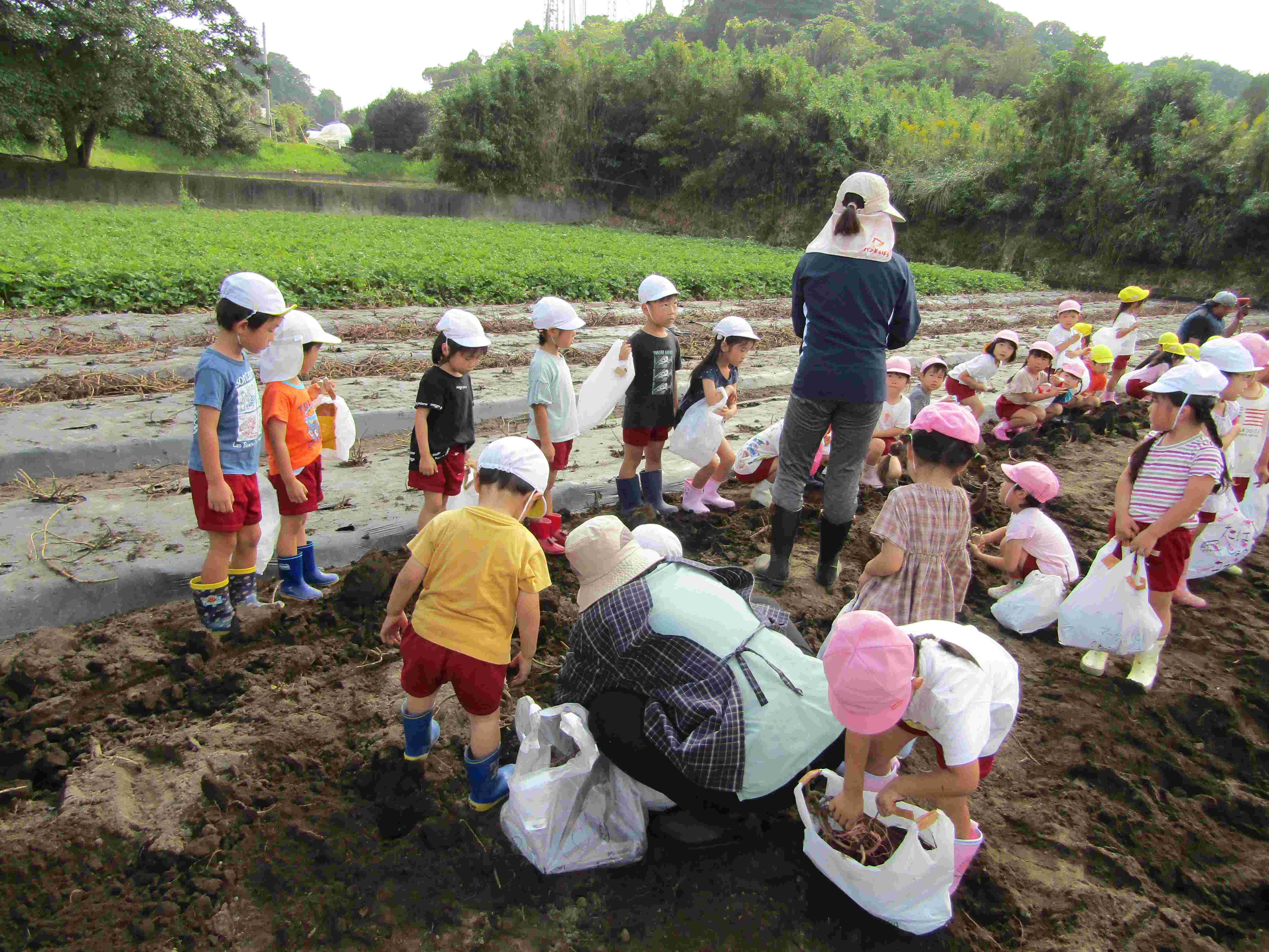 運動会も終わったところですが、日中はまだまだ暑いです。それでも、朝晩はすこし涼しくなり、すこしづつ秋めいてまいりました。秋は収穫の季節です。今日は、吉野町菖蒲谷地区にある農協の畑に行って、サツマイモの芋ほりをしました。幼稚園バス2台に分乗して、畑まで行き、まずはじめに農協の係の方からほり方の説明を聞きました。その後、みんなで土を掘って大きなサツマイモを掘り出しました。ひとりで5本も10本も掘り出す子もいて、大収穫でした。係のお父さん・お母さんがたも、お手伝いに来て下さり、子どもたちと一緒に芋ほりをしてくださいました。掘り出したサツマイモは、それぞれのおうちに持ち帰りました。おうちで料理してたくさん食べてくださいね。