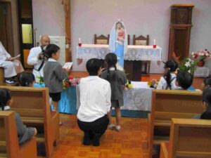 10月は、カトリック教会では「ロザリオの月」です。今日は、その「ロザリオの月」にちなんで「マリア祭」を実施しました。マリア様は、イエス・キリストのお母さんですが、全人類のお母さんでもあります。今日は、あいにくの雨模様でしたので、本来ならば園庭での聖母行列からでしたが、聖堂での行事だけになってしまいました。聖堂では、マリア様にこれまでの子どもたちの健全な成長に感謝するとともに、全世界の大変な状況にある子供たちのことを知って、その子供たちにも大きなお恵みがあるようにとの願いで、お祈りをしたり、お花をささげたりしました。カトリック吉野幼稚園の良い子だけではなく、世界中のすべての子どもたちが無事に大きくなりますように!!!