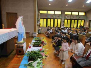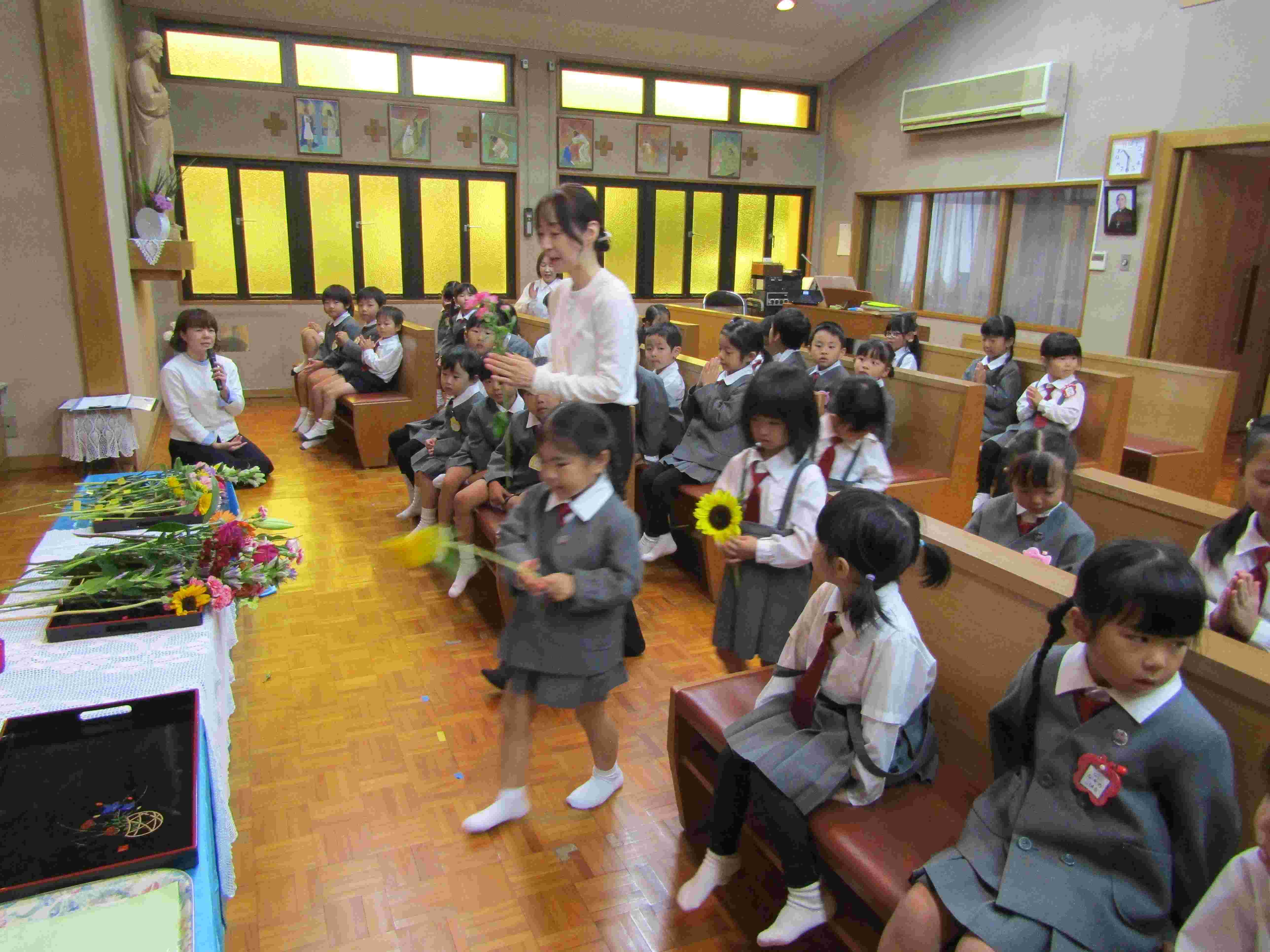 10月は、カトリック教会では「ロザリオの月」です。今日は、その「ロザリオの月」にちなんで「マリア祭」を実施しました。マリア様は、イエス・キリストのお母さんですが、全人類のお母さんでもあります。今日は、あいにくの雨模様でしたので、本来ならば園庭での聖母行列からでしたが、聖堂での行事だけになってしまいました。聖堂では、マリア様にこれまでの子どもたちの健全な成長に感謝するとともに、全世界の大変な状況にある子供たちのことを知って、その子供たちにも大きなお恵みがあるようにとの願いで、お祈りをしたり、お花をささげたりしました。カトリック吉野幼稚園の良い子だけではなく、世界中のすべての子どもたちが無事に大きくなりますように!!!